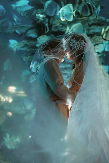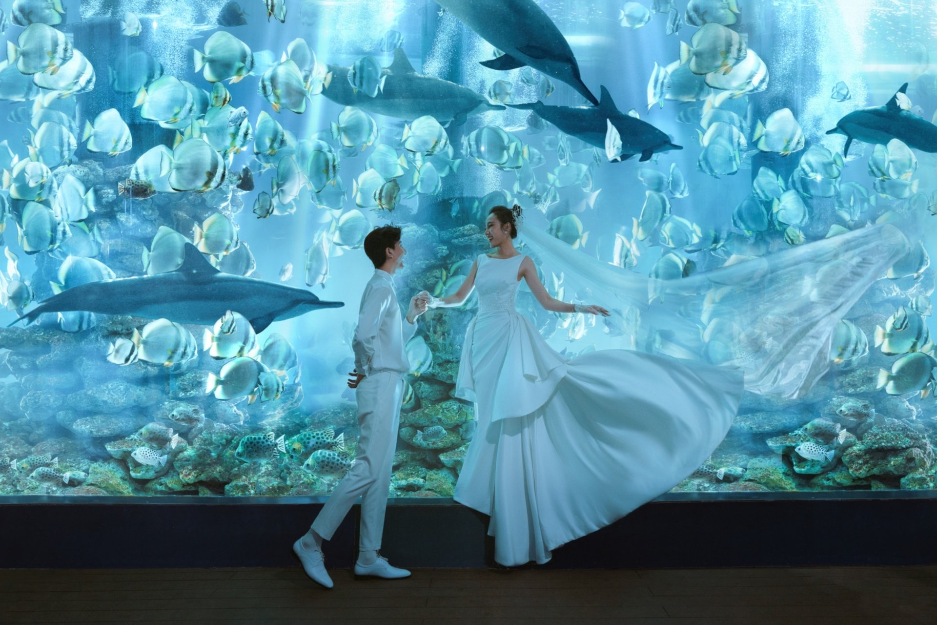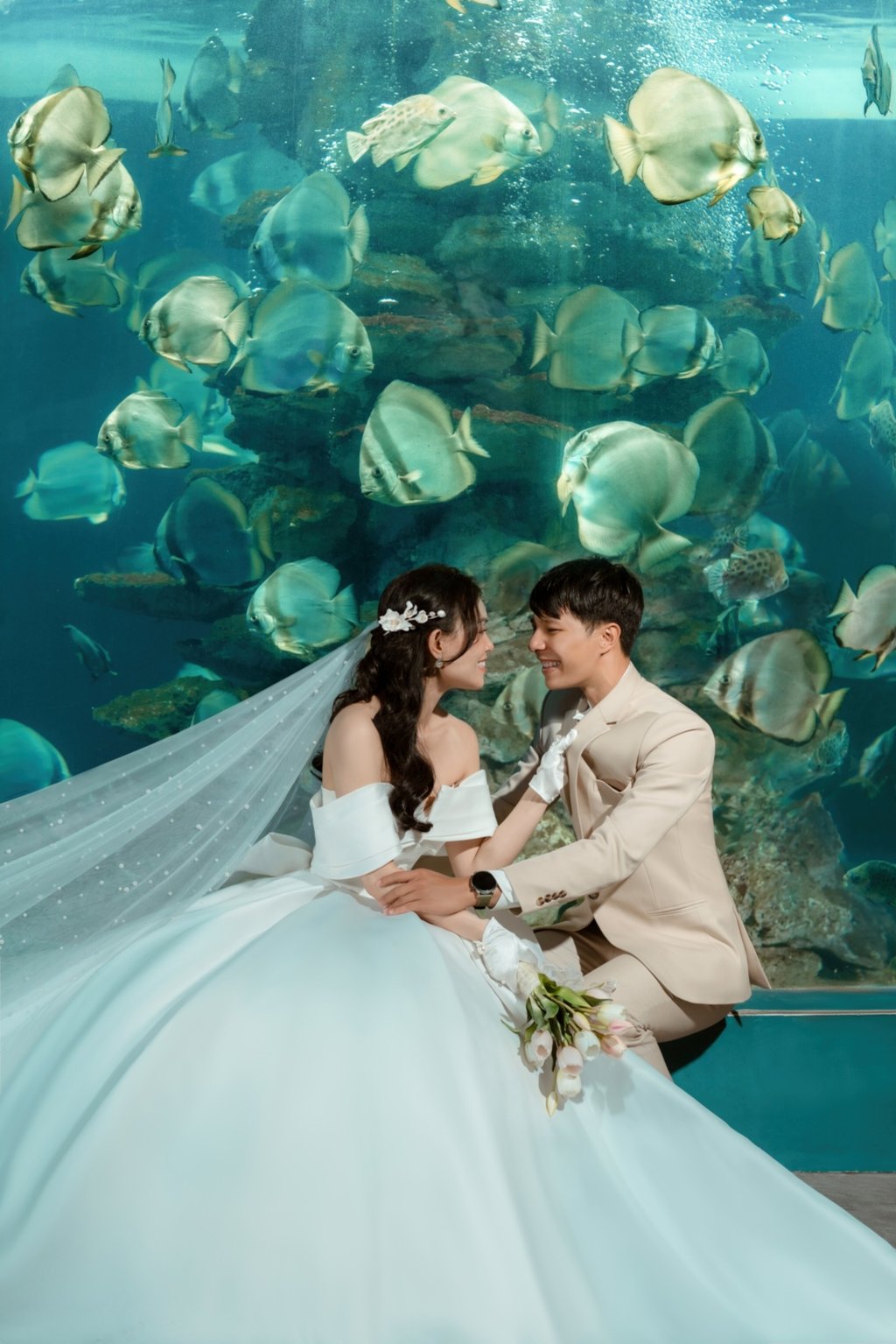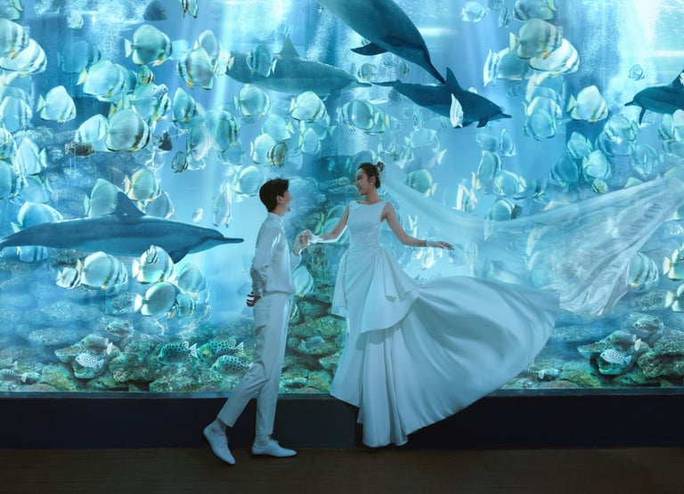 Sắc xanh thẫm của biển cả cùng hàng ngàn chú cá nhỏ tung tăng bơi lội sẽ khiến bộ ảnh cưới của bạn trở nên sống động và huyền ảo hơn bao giờ hết. SOHO Wedding đã từng thực hiện nhiều bộ ảnh cưới Nha Trang tại Viện Hải Dương Học và nhận được sự yêu thích của nhiều cặp đôi.
