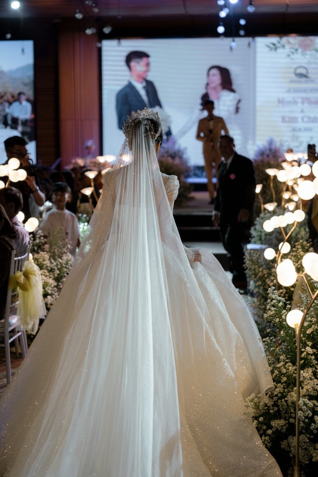 Nếu bạn muốn trở thành nàng công chúa lộng lẫy trong ngày cưới, hãy chọn kiểu tóc xoăn thả cài vương miện. Mái tóc được uốn xoăn lọn to bồng bềnh, kết hợp với vương miện đính đá, vương miện hoa hoặc vương miện ngọc trai sẽ giúp bạn tỏa sáng rạng ngời.